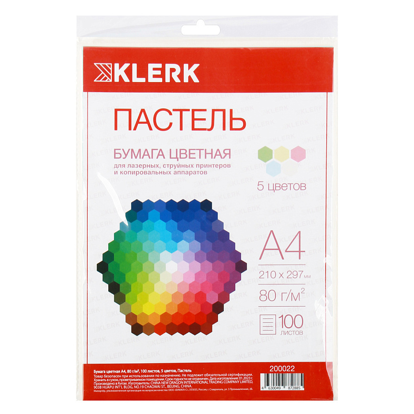 Цветная бумага для офисной техники KLERK обладает высокой однородностью цвета и точной нарезкой листа. Применяется для печати на копировально-множительной технике, лазерных и струйных принтерах. Предназначена для печати прайс-листов, рекламных и информационных объявлений, классификации печатной информации, приглашений. Возможно использование для переписки и изготовления аппликаций. Прозрачная упаковка, многоразовый клапан. В наборе 5 пастельных цветов по 20 листов.