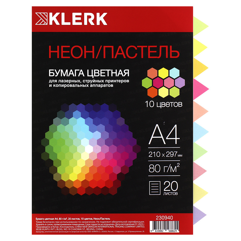 Цветная бумага для офисной техники KLERK обладает высокой однородностью цвета и точной нарезкой листа. Применяется для печати на копировально-множительной технике, лазерных и струйных принтерах. Предназначена для печати прайс-листов, рекламных и информационных объявлений, классификации печатной информации, приглашений. Возможно использование для переписки и изготовления аппликаций. Прозрачная упаковка, многоразовый клапан. В наборе 10 цветов по 2 листа.
