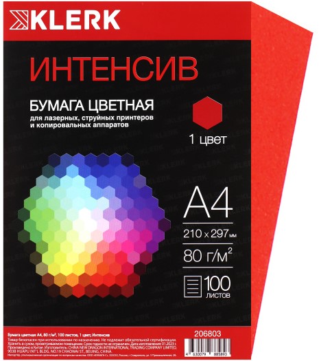 Бумага KLERK формат А-4, плотность 80 г/м2, 100 листов, цвет красный Интенсив