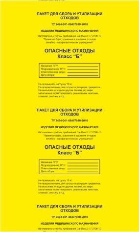 Пакет для медицинских отходов Класс Б - цвет желтые (опасные, рискованные)-потенциально-инфицированные отходы.Материал и инструменты загрязненные выделениями, в т.ч.кровью. Выделения пациентов. Патологоанатомические отходы. Органические операционные отходы (органы, ткани и т.п.) Все отходы из инфекционных отделений (в т.ч.пищевые). Отходы из микробиологических лабораторий, работающих с микроорганизмами 3-4 групп патогенности. Биологические отходы вивариев.