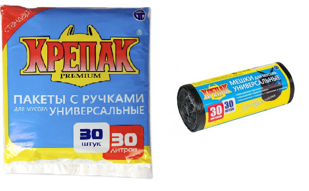 Мешки для мусора "Крепак" полиэтиленовые, хозяйственные, объем 30 литров с удобными ручками в количестве 30шт/уп, плотность 11мкр, размер 50х65 см, черного цвета.