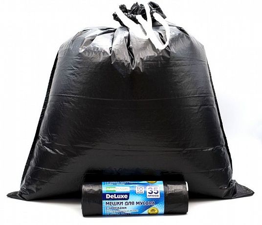 Мешки для мусора с завязками 35 литров, в рулоне 10 штук, 3-х слойные ПВД, 35 мкм, размер 50*60 см, серия «Deluxe».