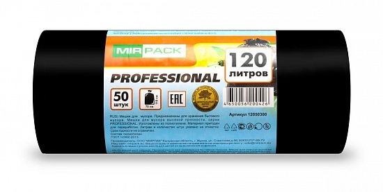 Мешки для мусора "MirPack PROFESSIONAL" ПСД 120л 50шт в рулоне, плотность 20 мкм, размер 68х105 см, черные
