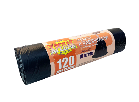 Мешки для мусора "Крепак" ПНД 120л 10шт в рулоне с завязками, плотность 16 мкм, размер 70х110см, черного цвета.