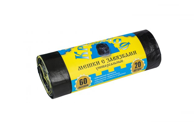 Мешки для мусора "Крепакоф" ПНД 60л 20шт в упаковке с завязками, плотность 12 мкм, размер 55х64см, черные
