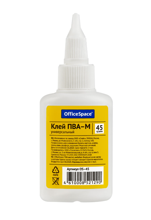 Клей ПВА OfficeSpace в пластиковой бутылочке с дозатором 45гр. Не оставляет следов и легко смывается водой.