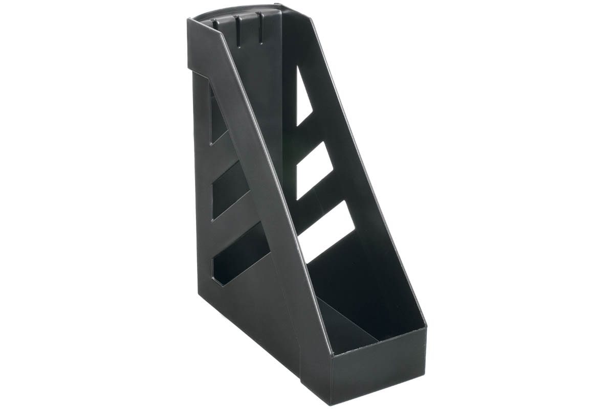 Вертикальный вместительный лоток для бумаг в классическом дизайне из высококачественного прочного пластика с гладкой глянцевой поверхностью. Фирменные сменные таблички для маркировки. Устойчивый, подходит для хранения тяжёлых папок и каталогов.