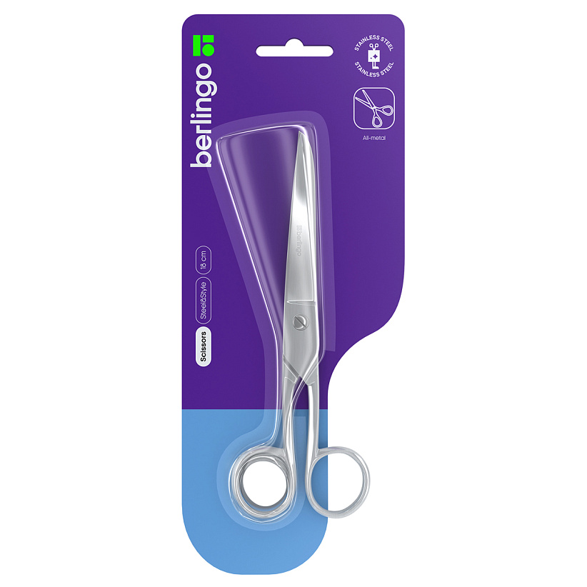 Ножницы предназначены для работы с бумагой, картоном, тканью и пленкой. Цельнометаллические. Длина 18 см. Упаковка - блистер с европодвесом.