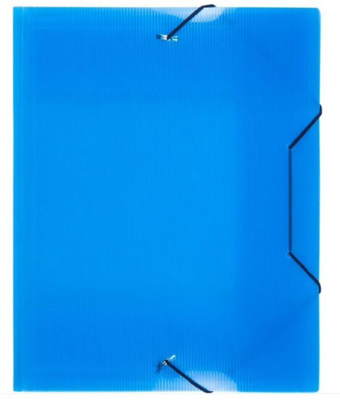 Папка на резинках формата А5 изготовлена из полупрозрачного пластика синего цвета, толщиной 0,7 мм. Имеет три внутренних клапана, закрывается с помощью двух угловых резинок. Ширина корешка — 15 мм. Размер папки — 200×254 мм. Для удобного хранения и транспортировки документов. Вмещает до 100 листов.