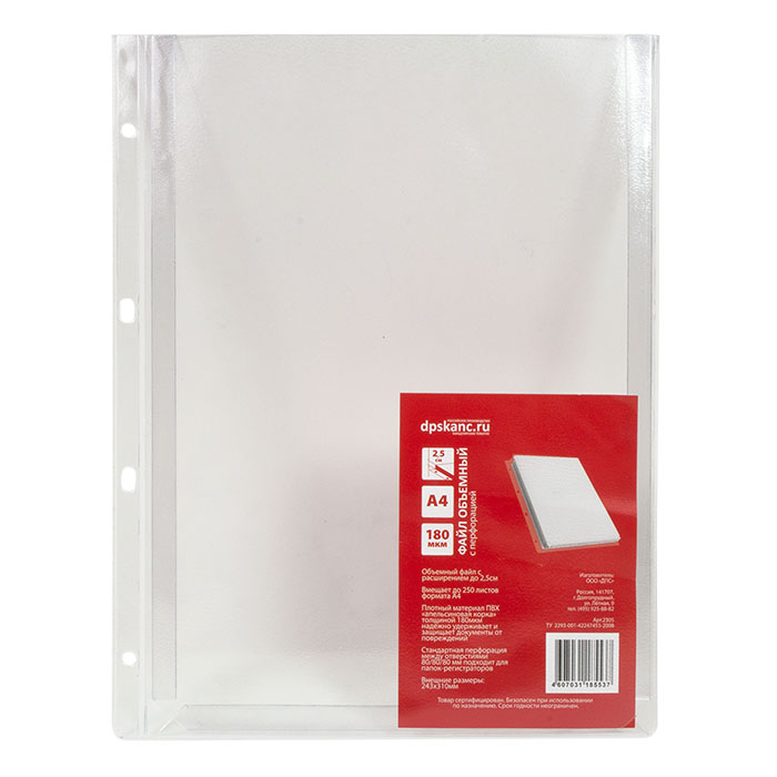 Вертикальный файл формата А4+. Изготовлен из ПВХ плотностью 0,18 мм (180 мкм). Фактура - апельсиновая корка. Расстояния между отверстиями - 80/80/80 мм. Расширение до 2,5 см. Вмещает до 250 листов.