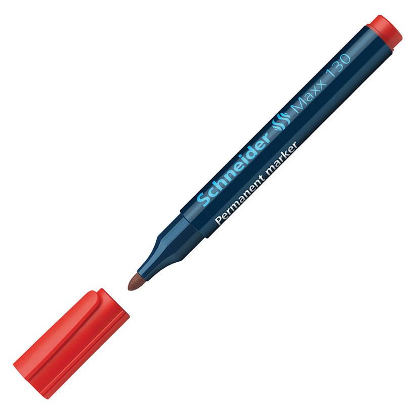 Перманентный маркер Schneider Maxx 130. Корпус маркера изготовлен из прочного и износостойкого пластика тёмно-синего цвета. Колпачок и заглушка на вершине корпуса соответствуют цвету чернил. Колпачок оснащён плотно прилегающем к нему пластиковым клипом. У маркера пулеобразный наконечник фломастерного типа, который оставляет линии толщиной от 1.0 до 3.0 мм. В маркере используются перманентные чернила насыщенного цвета на спиртовой основе, не содержащие вредные для здоровья ксилол и толуол. Маркер отлично пишет на большинстве твёрдых поверхностей, включая картон, бумагу, металл, стекло, дерево и пластик, при этом сделанные надписи быстро высыхают, не выцветают и не размываются. Чернила в маркере не пересыхают даже после 2-3-дневного пребывания без колпачка! Маркер отлично подойдёт для маркировки на различных поверхностях , а также в качестве инструмента для дизайнерских и оформительских работ.