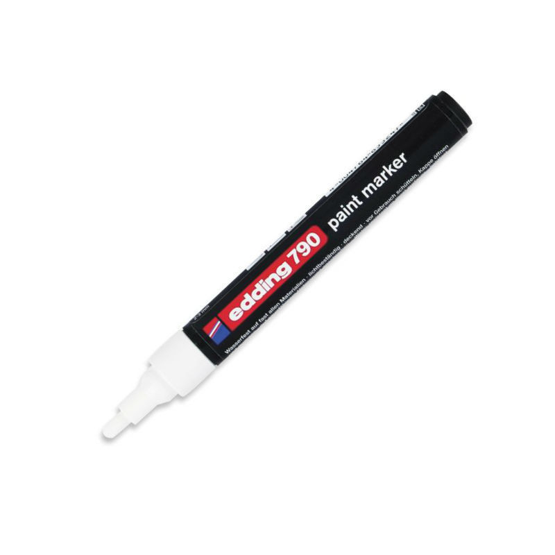 Маркер Edding 790/49, цвет чернил - белый, используется для промышленной непрозрачной маркировки практически всех материалов, например, стекла, пластика, дерева, металла, кабеля, проводов, резины. Рекомендован для письма на жирных, пыльных, грязных поверхностях. Лаковый маркер устойчив к кислотам, растворителям, механическому истиранию, свету. Высококонцентрированный пигмент хорошо ложится на гладкие и шероховатые поверхности.