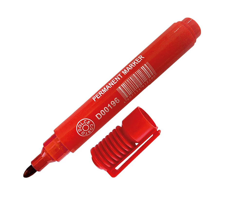Маркер перманентный DOLCE COSTO красный предназначен для нанесения постоянных, практически не удаляемых, надписей на любые поверхности. Идеально подходит для работы по металлу, дереву, стеклу, картону, плaстику, керамике и т.д. Пулевидный наконечник обеспечивает толщину линии письма от 2 до 5 мм, в зависимости от угла наклона и нажима