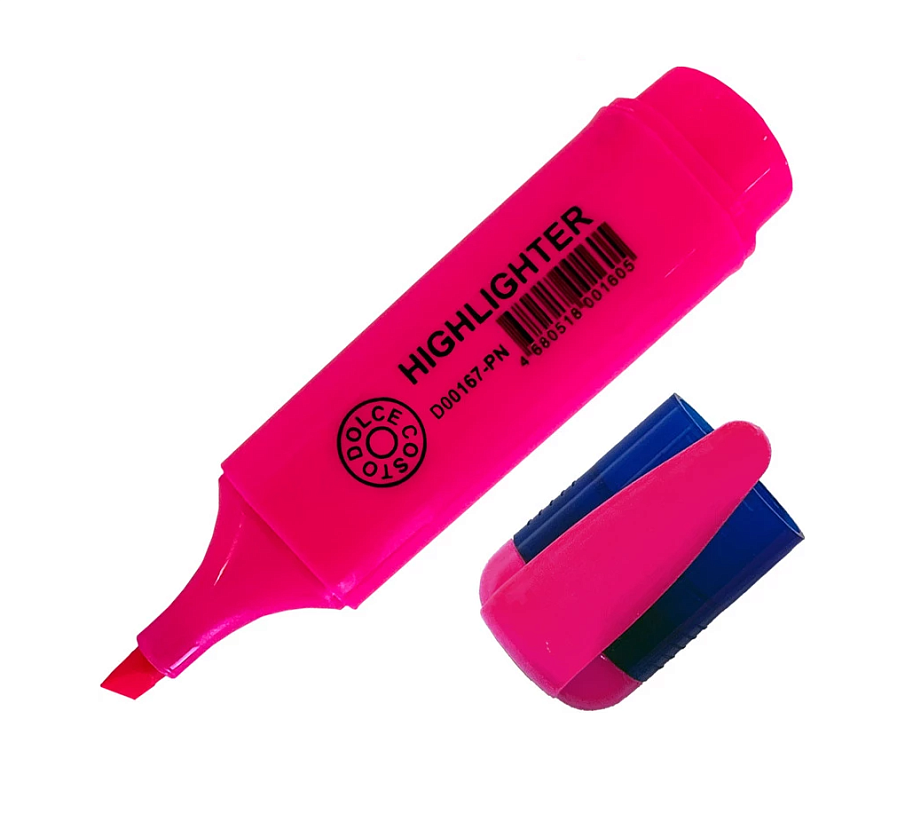 Маркер-текстовыделитель DOLCE COSTO, розовый, предназначен для выделения текста на любых типах бумаг. Цвет чернил соответствует цвету корпуса. Чернила на водной основе с флюоресцентным пигментом. Клиновидный наконечник обеспечивает ширину линии письма от 1 до 5 мм.