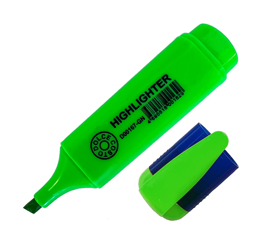 Маркер-текстовыделитель DOLCE COSTO, зеленый, предназначен для выделения текста на любых типах бумаг. Цвет чернил соответствует цвету корпуса. Чернила на водной основе с флюоресцентным пигментом. Клиновидный наконечник обеспечивает ширину линии письма от 1 до 5 мм.