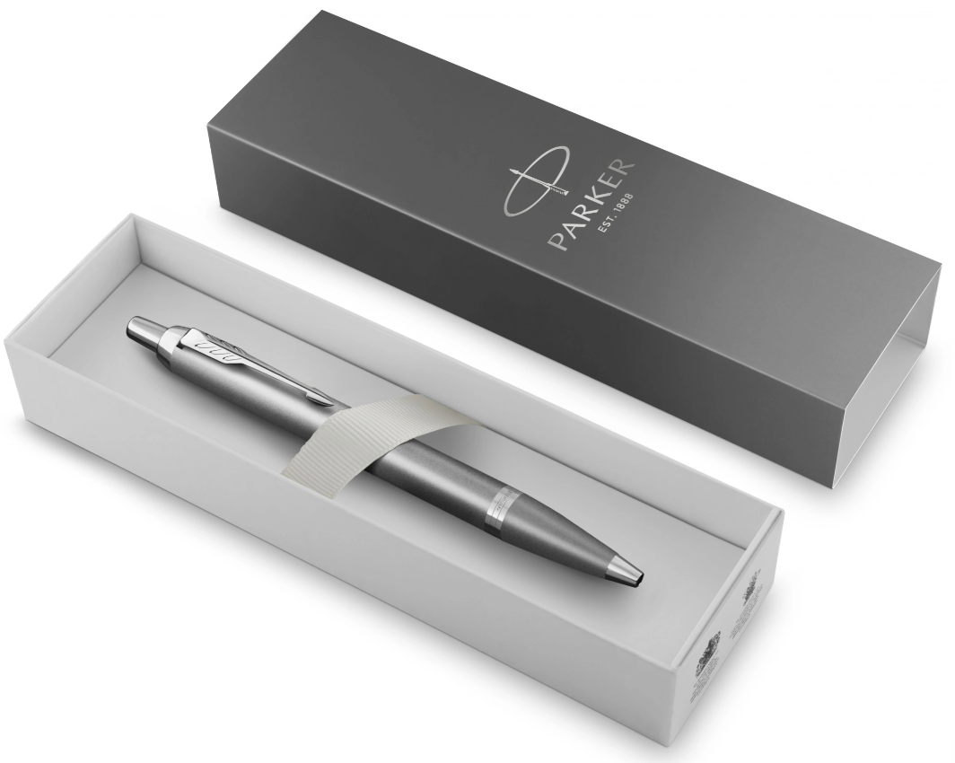 Ручка шариковая PARKER IM Writing Rituals K331 серый M синий стержень, нержавеющая сталь, серебристый отделка, подарочная упаковка