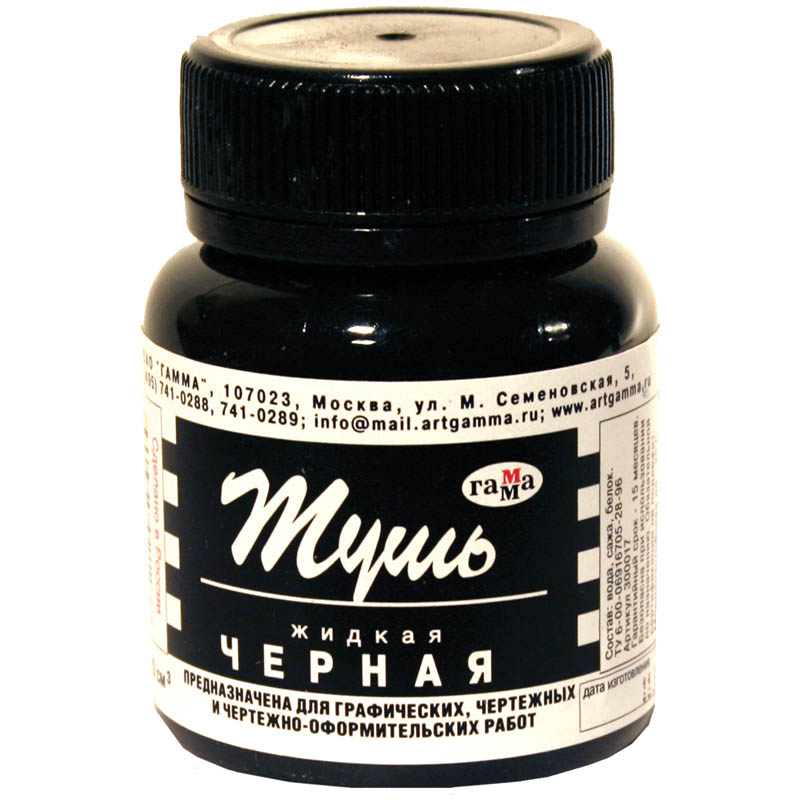 Тушь для графических, чертежных, чертежно-оформительских работ и каллиграфии. Сочетает яркость цветов и четкость линий. Оптимальная вязкость, легкость и удобство набора туши на рапидограф или рейсфедер. Устойчива к действию воды — достаточно промокнуть чертеж и тушь не растечется. Выдерживает температуру до −25°C.