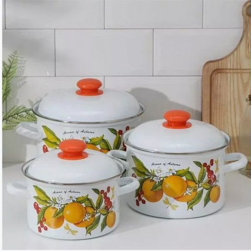 Набор кастрюль 6 предметов С-129АП2/4 Фруктовая фантазия, кастрюли 2л, 3л, 4,5л с крышками, эмалированная сталь, цвет белый