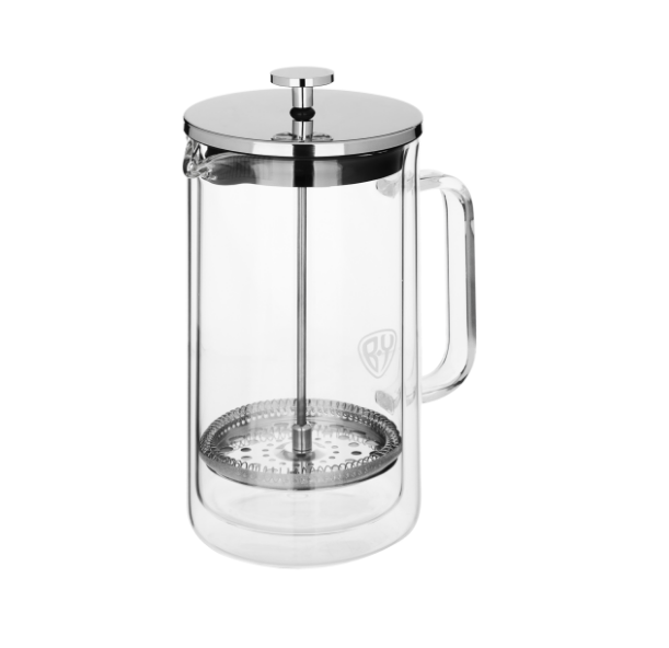 Френч-пресс BY из жаропрочного стекла с двойными стенками объемом 1000 мл, Двойные стенки исключают ожоги рук, а также сохраняют температуру напитка, позволяя получить насыщенный настой. Поршень из нержавеющей стали не подвержен коррозии, не искажает вкус напитков, надежный и долговечный. Френч-пресс идеально подходит для приготовления чая, кофе и чайных напитков.