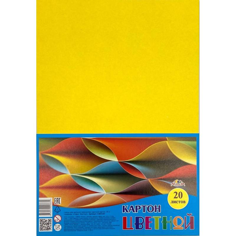 Цветной картон 20 листов, одного цвета. Формат А4. Размер 200 х 280 мм. Внутренний блок изготовлен немелованного картона. Плотностью 200 гр/м2. Упаковка - ПЭТ пакет с европодвесом.