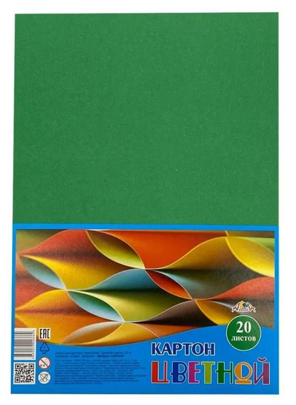 Цветной картон 20 листов, одного цвета. Формат А4. Размер 200 х 280 мм. Внутренний блок изготовлен немелованного картона. Плотностью 200 гр/м2. Упаковка - ПЭТ пакет с европодвесом.