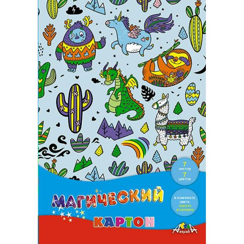 Цветной картон "Магический Апплика" формат А-4, 7 листов 5 цветов немелованного картона+ 2 цвета золото/серебро окрашенных метализированной краской, в папке