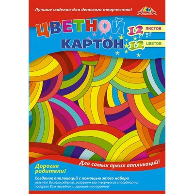 Цветной картон "Апплика" формат А-4, 12 листов 12 цветов, мелованный, односторонний, с клеевым краем, ассорти
