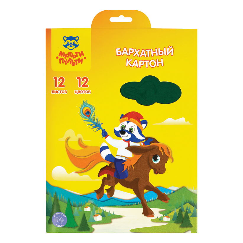 Цветной картон Мульти-Пульти "Енот в волшебном мире" формат А-5, 12 листов 12 цветов, мелованный, бархатный, плотность однотонного картона: 230 г/кв.м., в папке с европодвесом