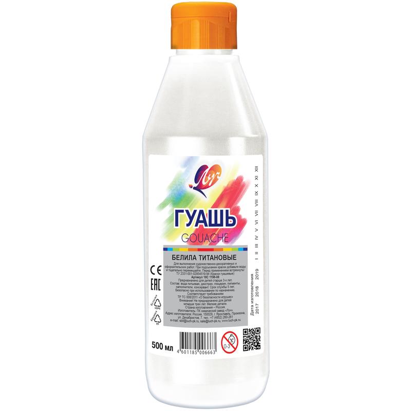 Гуашь "Луч" 500 мл белила титановые,оттенок желтоватый , укрывистость высокая
