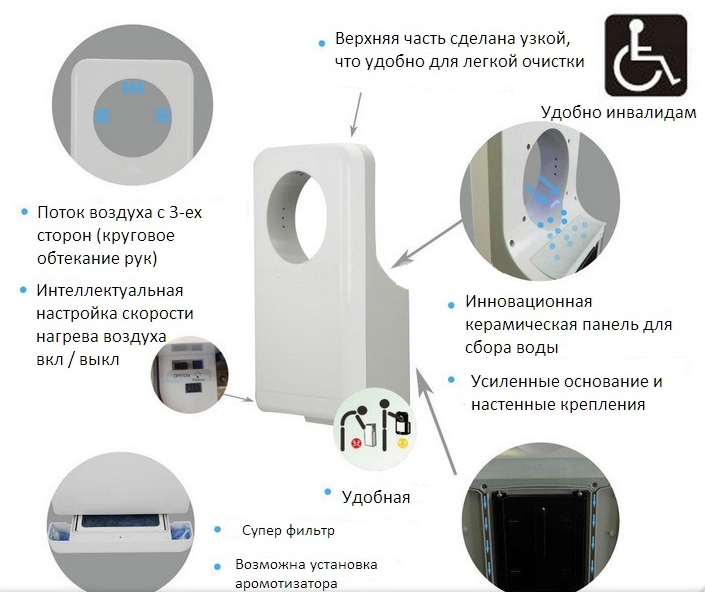 Поток воздуха с 3-ех сторон (круговое обтекание рук).Инновационная керамическая панель для сбора воды.Супер фильтр (HEPO+ антибактериальный+карбон).Питание: 220 В.Номинальная мощность: 1450 Вт (мощность электромотора: 900 Вт, тена: 550 Вт).Материал: ударопрочный пластик.Цвет: белый, задняя часть серая.Класс защиты: IPX4.Скорость воздуха: 90-135 м/с (регулируется).Производительность: 89-124 м3/час.Отключаемый тэн для экономии электроэнергии.Регулируемая скорость электромотора для изменения уровня шума.Двухцветная подсветка (красная + синяя).Уровень шума: 65-78 Дб.Изоляция: Класс 1.Автоотключение через 25 сек.Время сушки рук: 5-10 сек.Антибактериальное покрытие.Размер (В*Ш*Г): 620*320*185 мм.